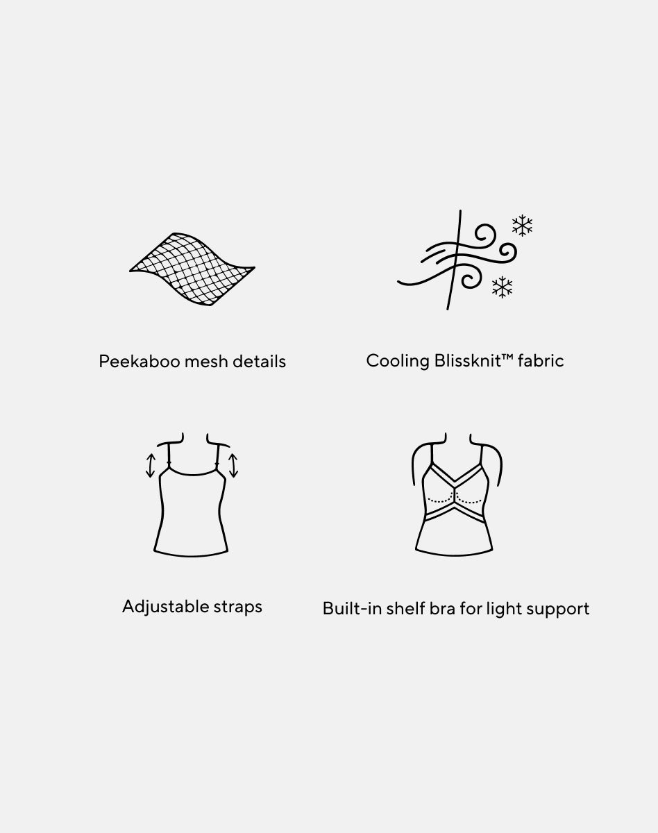 Your best sleep ever awaits. TENCEL™ Blissknit™ fabric is buttery soft against skin and ultra breathable to keep you comfortable and cool all night long. Mesh panels let in extra airflow. A light shelf bra keeps everything in place. and adjustable straps let you customize your fit. Mix and match with our BlissWear Short and BlissWear Pant.
